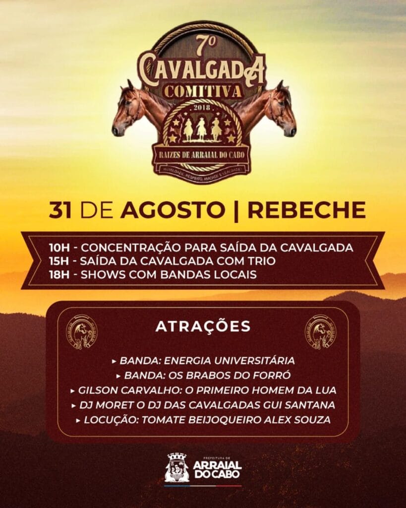 A prefeitura de Arraial do Cabo, por meio da Secretaria de Governo e Eventos, em parceria com a Comitiva Raízes de Arraial do Cabo, convidam para um dia de muita festa e tradição!