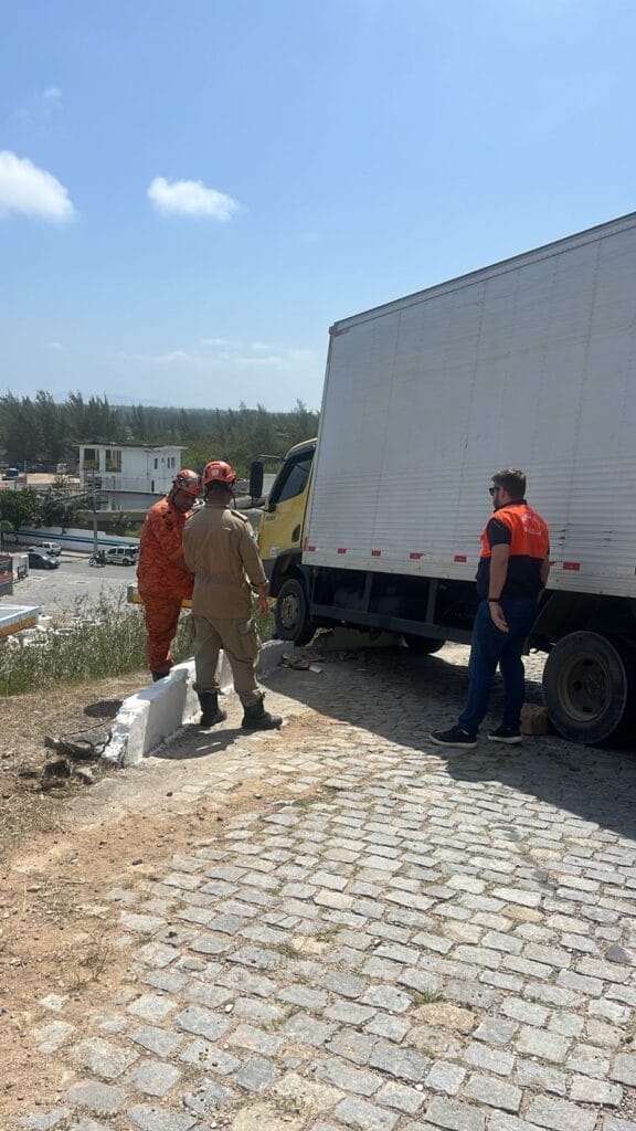 A Defesa Civil de Arraial do Cabo foi acionada na tarde desta segunda-feira (25) após um caminhão ficar pendurado na estrada de descida do Morro da Boa Vista.