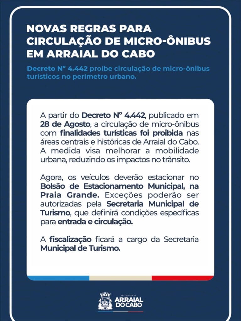 A Prefeitura de Arraial do Cabo publicou na quinta-feira (28), o novo Decreto Nº 4.442, que proíbe a circulação de micro-ônibus com finalidade turística no perímetro urbano do município.