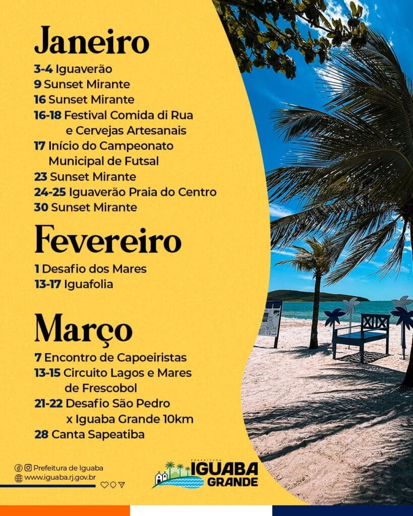 Com o lançamento do calendário, Iguaba Grande reforça seu posicionamento como um município que investe em planejamento, turismo sustentável e desenvolvimento contínuo, oferecendo experiências para moradores e visitantes durante todos os meses do ano. Confira o calendário completo em nosso site através do link: https://iguaba.rj.gov.br/calendario-de-eventos-2026/