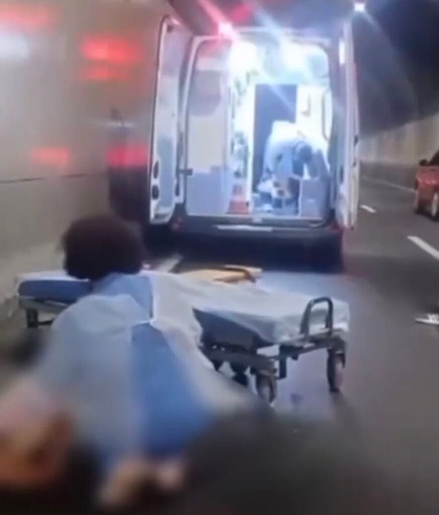 As imagens mostram o paciente caído no chão do túnel, enquanto veículos reduziam a velocidade para evitar atropelamentos. Motoristas e motociclistas pararam para prestar auxílio imediato, sinalizar a pista e proteger a vítima até que a ambulância retornasse ao local.