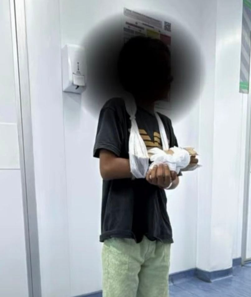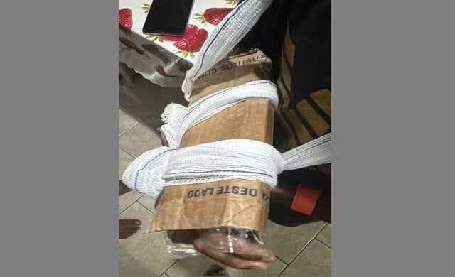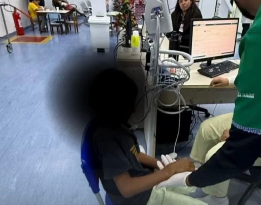 Diante da situação, profissionais de saúde confeccionaram uma tala improvisada com papelão, com o objetivo de oferecer suporte provisório até que o atendimento especializado pudesse ser realizado.